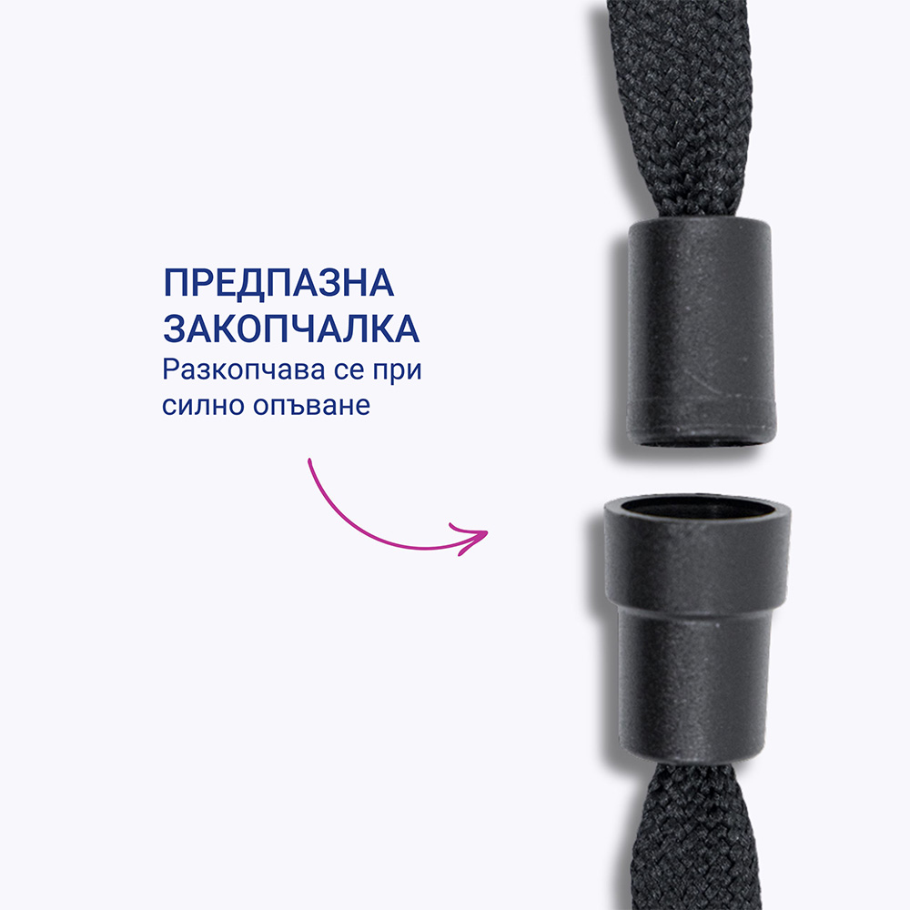 - Безопасност на първо място: Лентата разполага със safety break (предпазна закопчалка), която се отваря автоматично при рязко дръпване или заклещване, гарантирайки сигурност за потребителя.