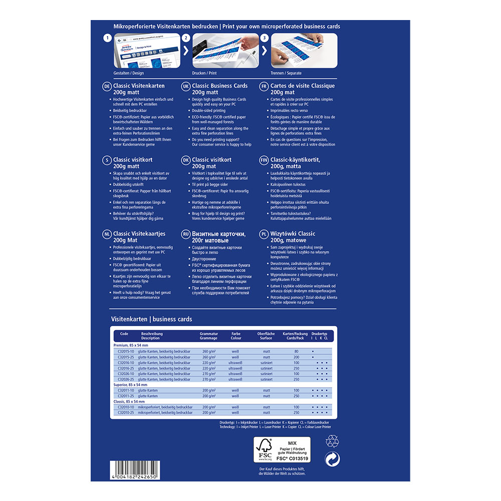Създайте своите професионални визитки бързо и лесно с безплатния софтуер на Avery Zweckform. Изберете от богата галерия с готови шаблони или качете собствен дизайн – всичко, което трябва да направите след това, е просто да ги разпечатате.