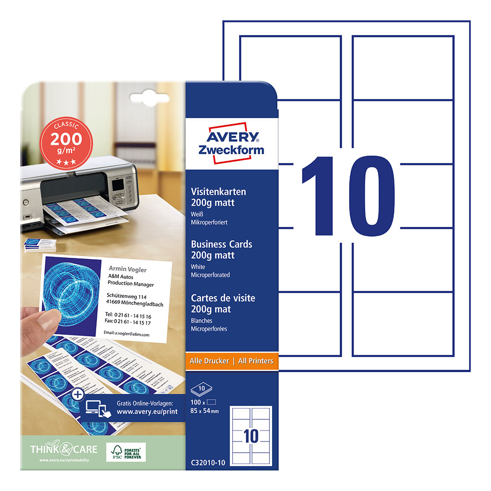 Бели матови визитки Avery за двустранен печат.