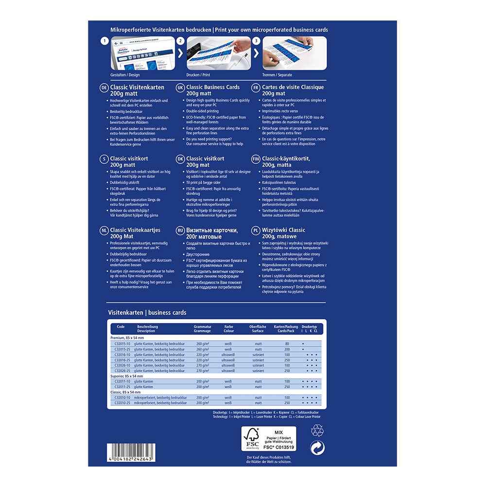 Създайте своите професионални визитки бързо и лесно с безплатния софтуер на Avery Zweckform. Изберете от богата галерия с готови шаблони или качете собствен дизайн - всичко, което трябва да направите след това, е просто да ги разпечатате.