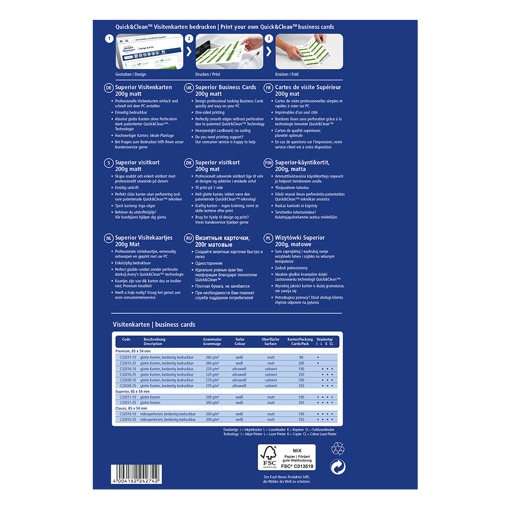 Създайте своите професионални визитки бързо и лесно с безплатния софтуер на Avery Zweckform. Изберете от богата галерия с готови шаблони или качете собствен дизайн - всичко, което трябва да направите след това, е просто да ги разпечатате.