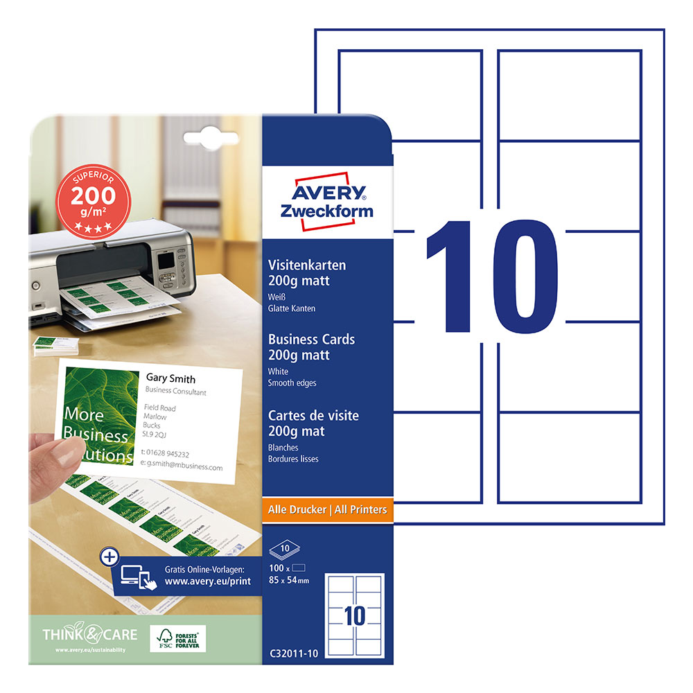Бели матови визитки Avery за едностранен печат.