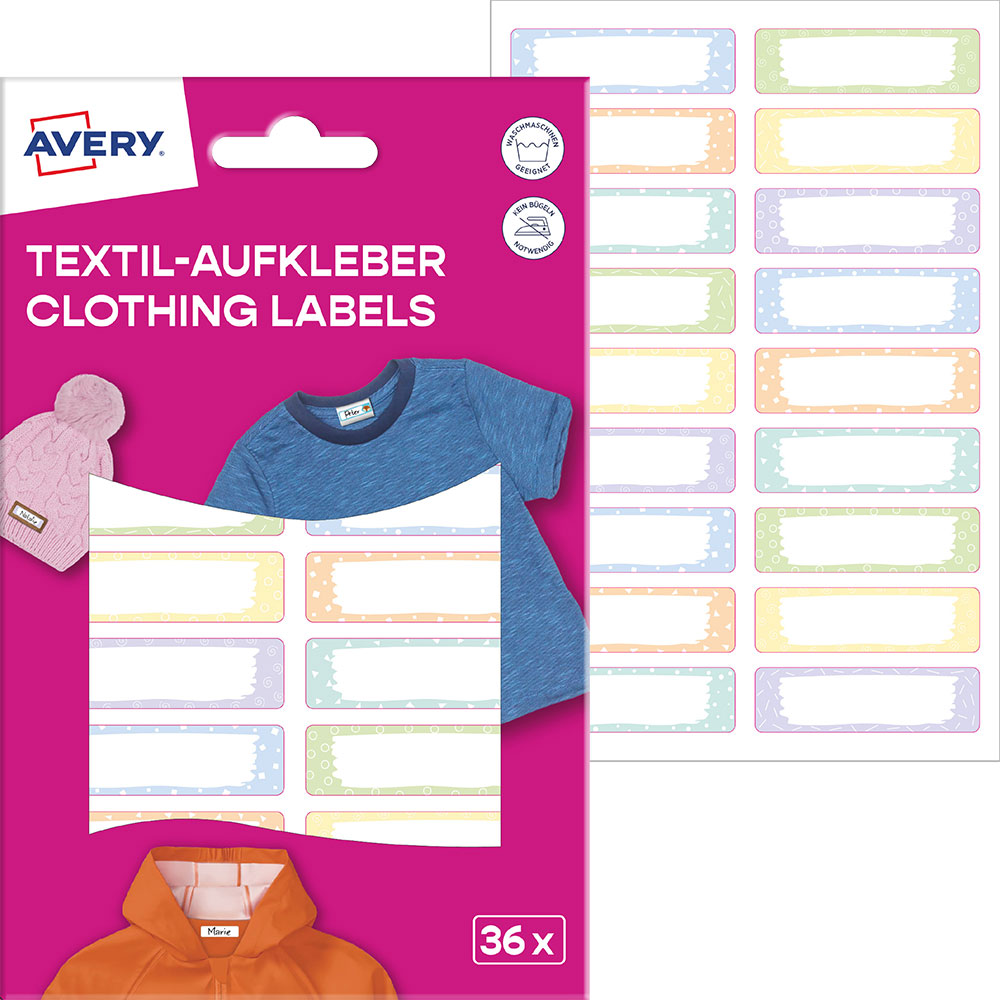 Самозалепващи се текстилни етикети за дрехи Avery „Пастелни шарки" за ръчно надписване.