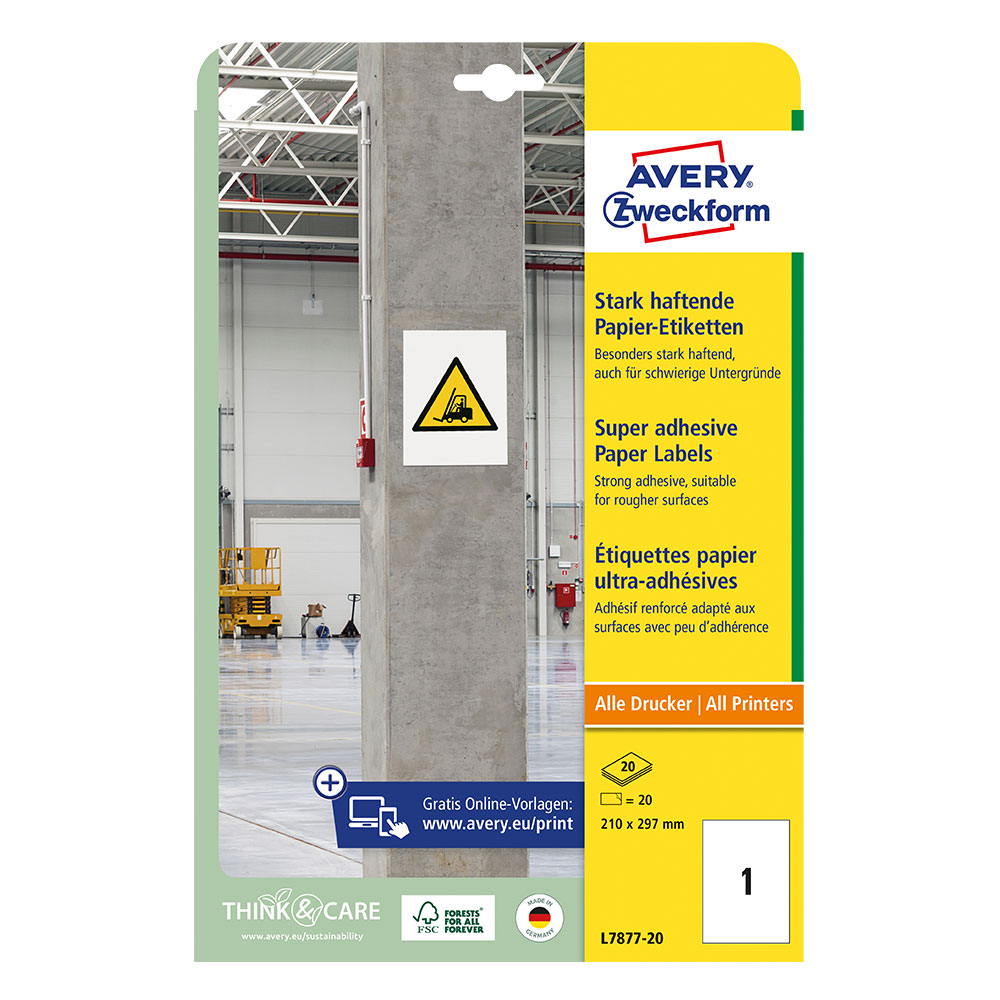 Когато стандартното лепило не е достатъчно, моделът L7877 на Avery Zweckform предлага решението. Тези етикети притежават двойно по-силно сцепление в сравнение с конвенционалните хартиени етикети. Те са специално разработени за „трудни“ повърхности като грапав картон, пластмасови контейнери, метал или леко запрашени среди. Целият формат А4 ви дава пълна свобода да отпечатате големи информационни табели или да изрежете специфични форми, които ще останат неподвижни дълго време.
