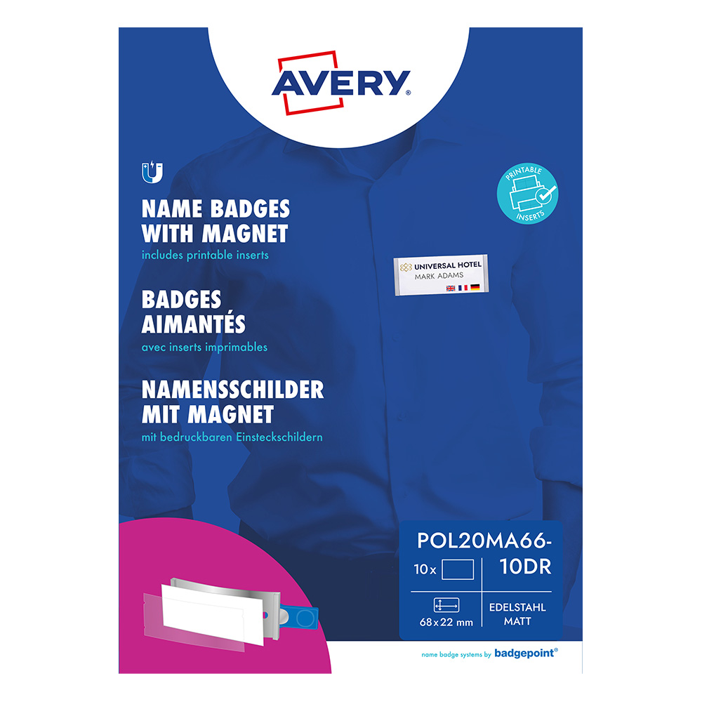 Придайте на екипа си елегантен и професионален вид с премиум баджовете Avery. Създадени за дълготрайна употреба, тези баджове са идеалното решение за всички индустрии като здравеопазване, туризъм, гастрономия, хотелиерство, услуги и търговия на дребно, както и за търговски панаири, събития и други мероприятия, където визията е от първостепенно значение.