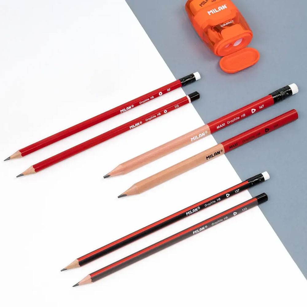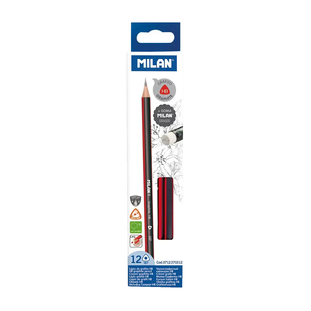 Подобрете преживяването си при писане и рисуване с висококачествения черен графитен молив на испанската марка Milan с твърдост HB и гумичка - aбсолютният стандарт за ежедневно писане и чертане.