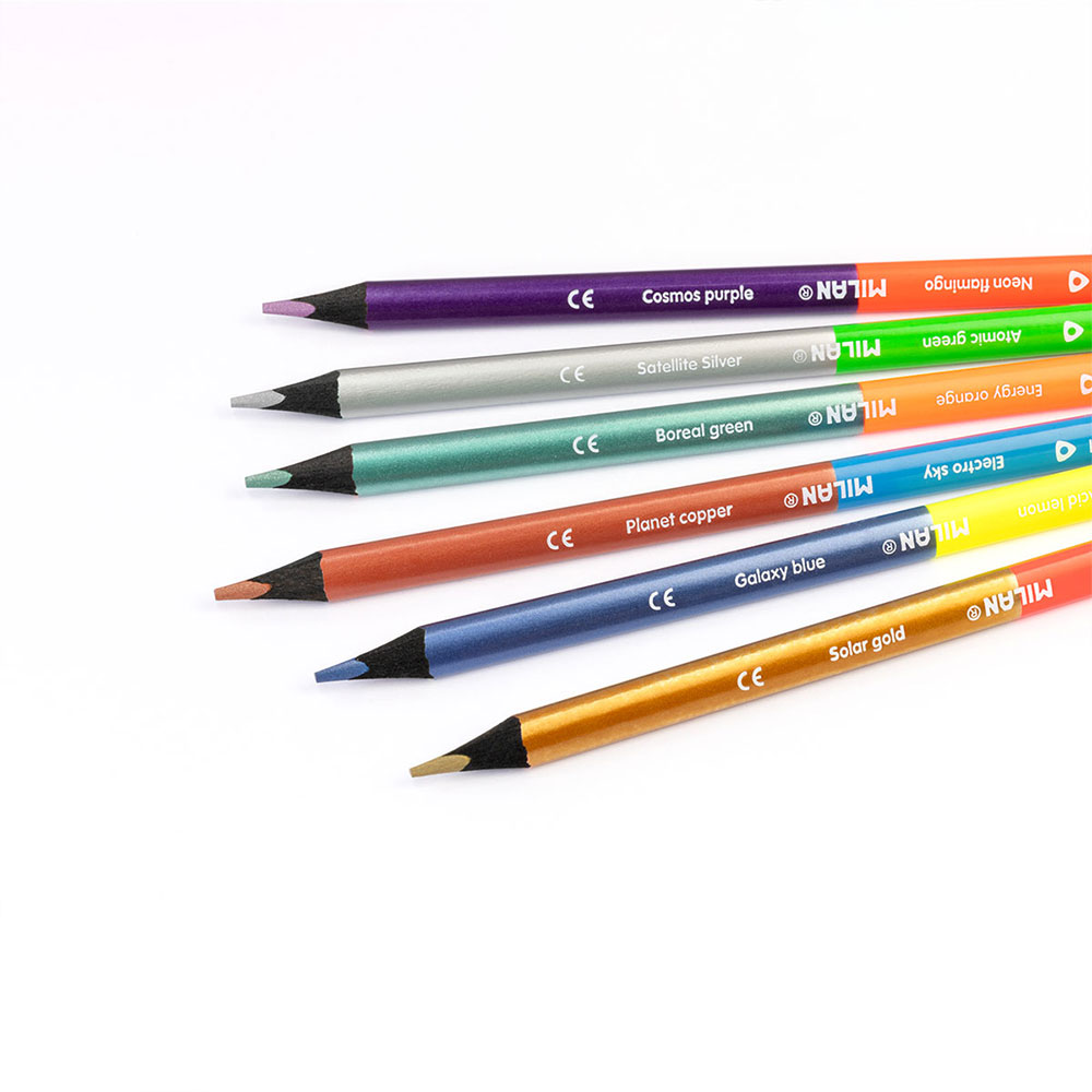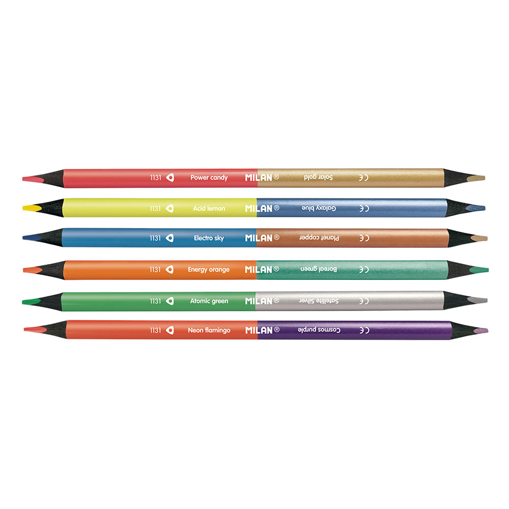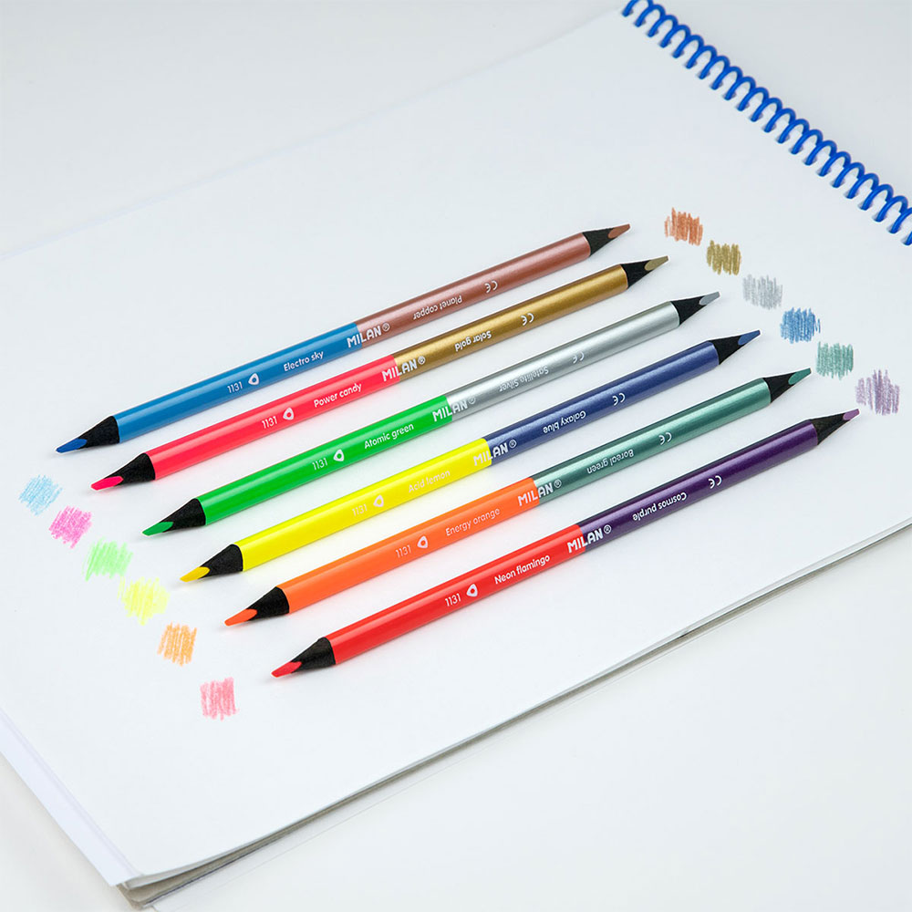 Добавете блясък и неонова енергия към вашите рисунки с уникалния комплект двустранните цветни моливи на испанската марка Milan.