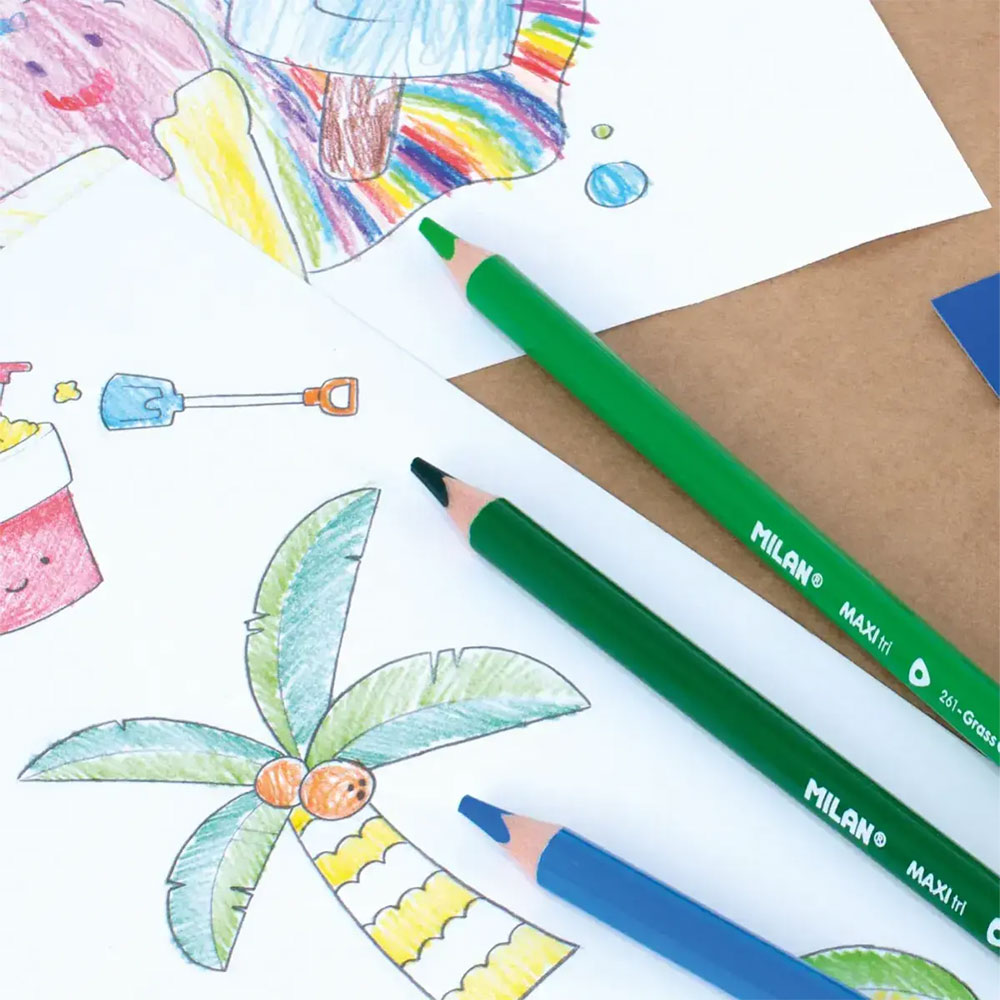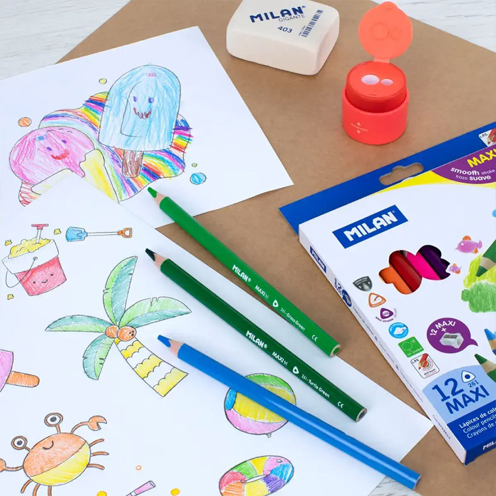 Комплектът от 12 цветни моливи от серията MAXI на Milan с включена острилка е специално разработен за най-малките художници, които тепърва ще развиват своята моторика и творчески умения.