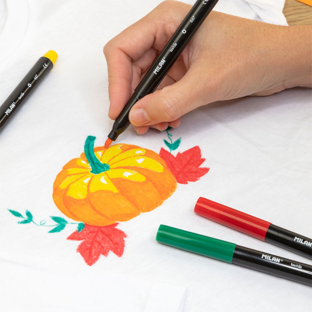 Искаш уникална тениска, която никой друг няма? С флумастерите за плат на Milan можеш да нарисуваш свои собствени герои, лога или послания върху всяка светла памучна повърхност. Те превръщат старите дрехи в нови произведения на изкуството. Лесни са за употреба, а цветовете остават ярки дори след многократно пране.