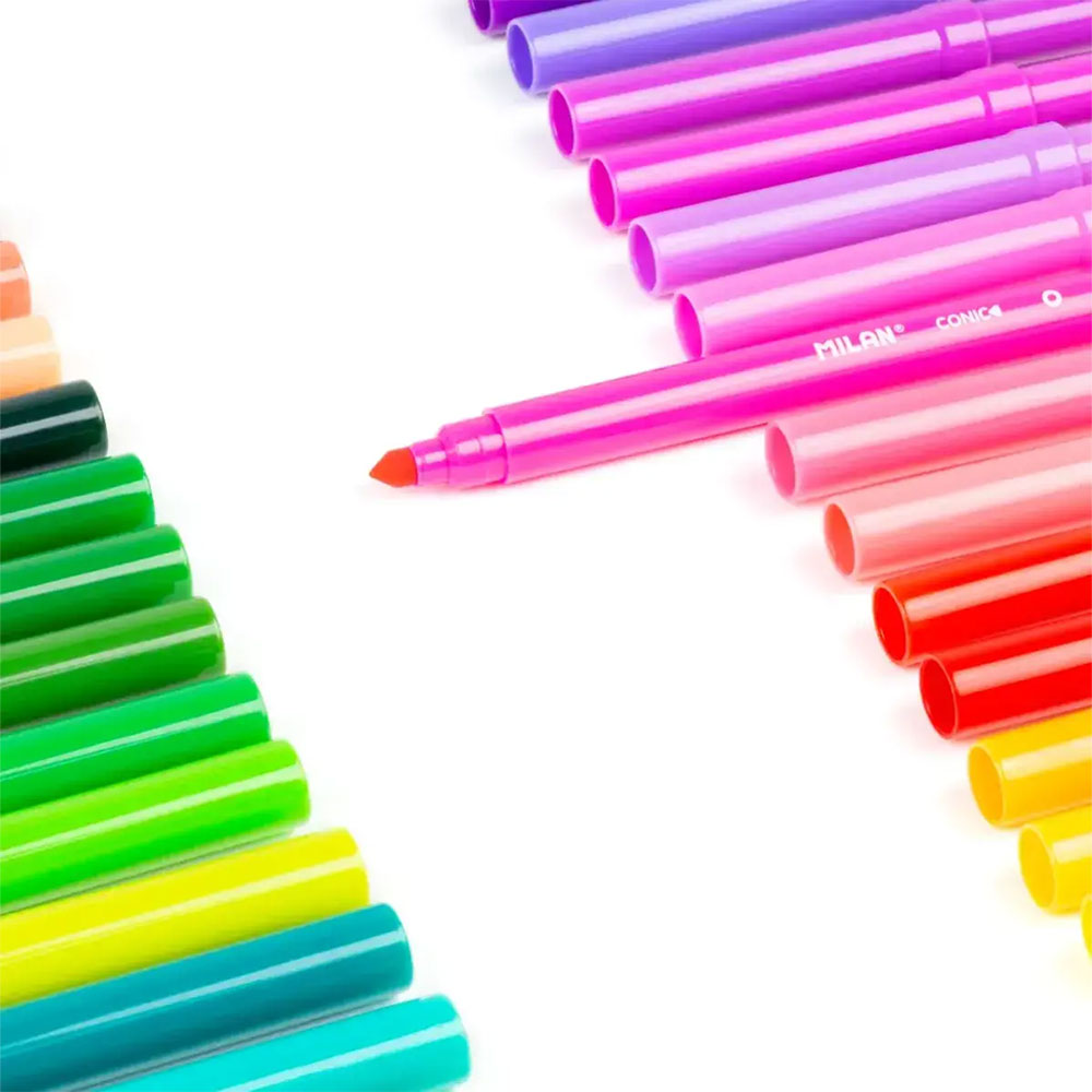 Открийте магията на рисуването с флумастерите на Milan! Благодарение на своя специален коничен връх, тези флумастери са истинско "2 в 1" решение. Детето може да използва върха за изключително фини линии и контури, или да наклони флумастера, за да запълни големи площи с дебел и плътен цвят.