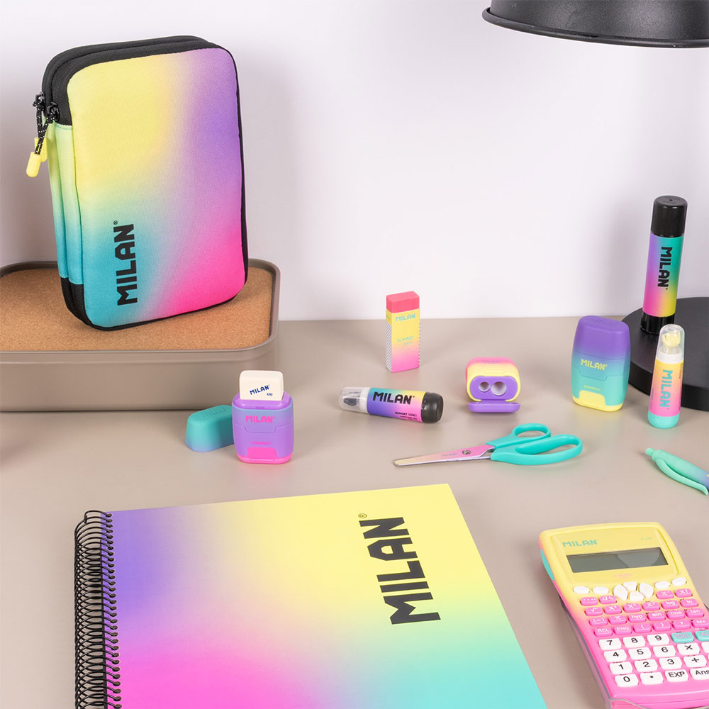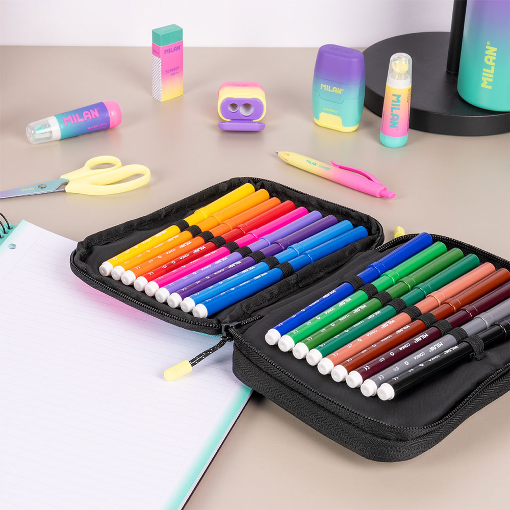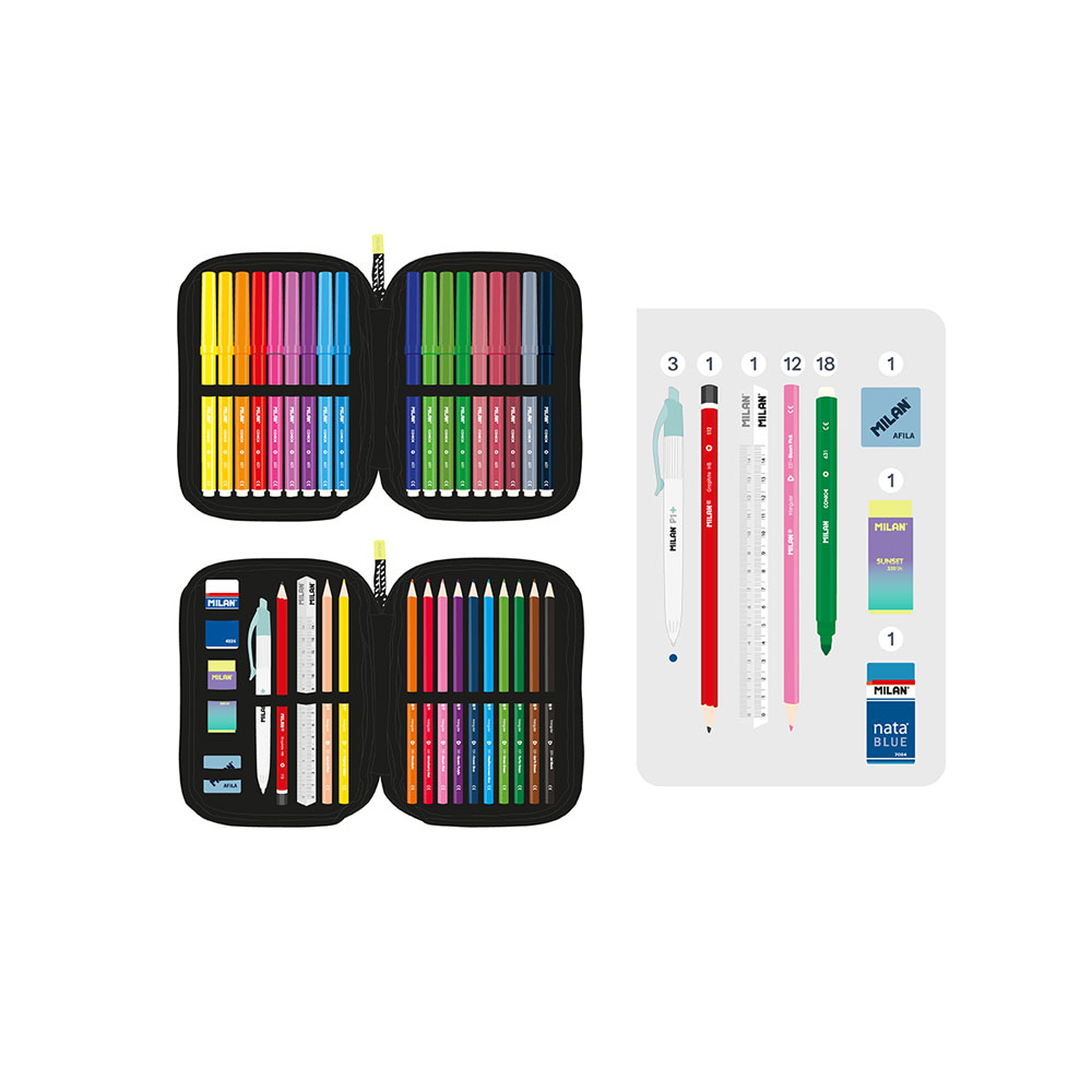 Организирайте учебния ден с безпогрешен стил и качество с пълен комплект от колекция Sunset на Milan! Този модел в елегантен черен цвят с деликатни преливащи нюанси е идеалното решение за ученици, които ценят както естетиката, така и практичността. Компактен, но изключително функционален, той идва напълно оборудван с висококачествени пособия Milan, готови за употреба още от първия ден.