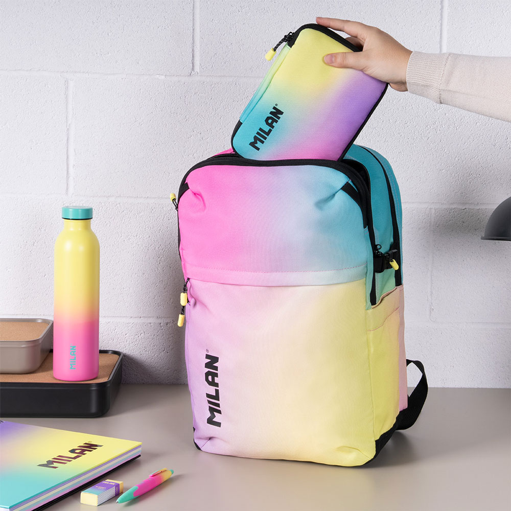- Уникална визия: Комбинацията от класическо черно и преливащи цветове, вдъхновени от залеза, прави аксесоара стилен и подходящ както за по-малки, така и за по-големи ученици.