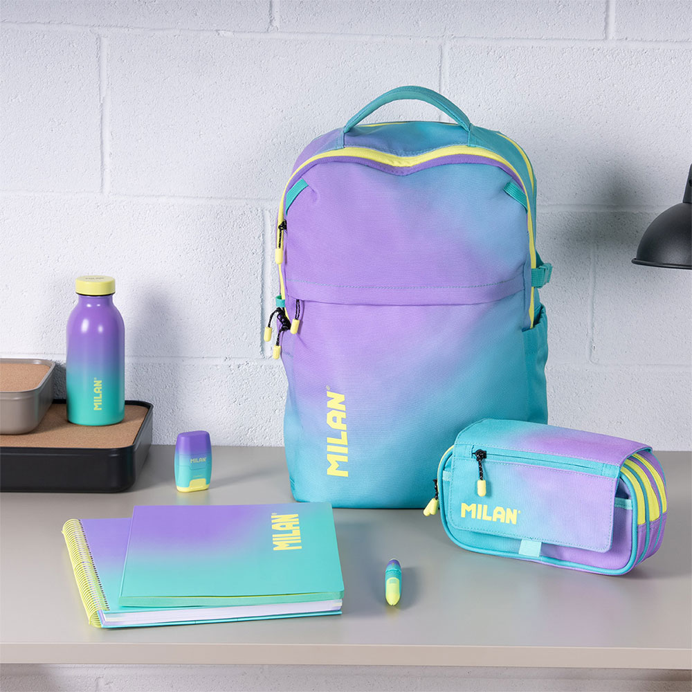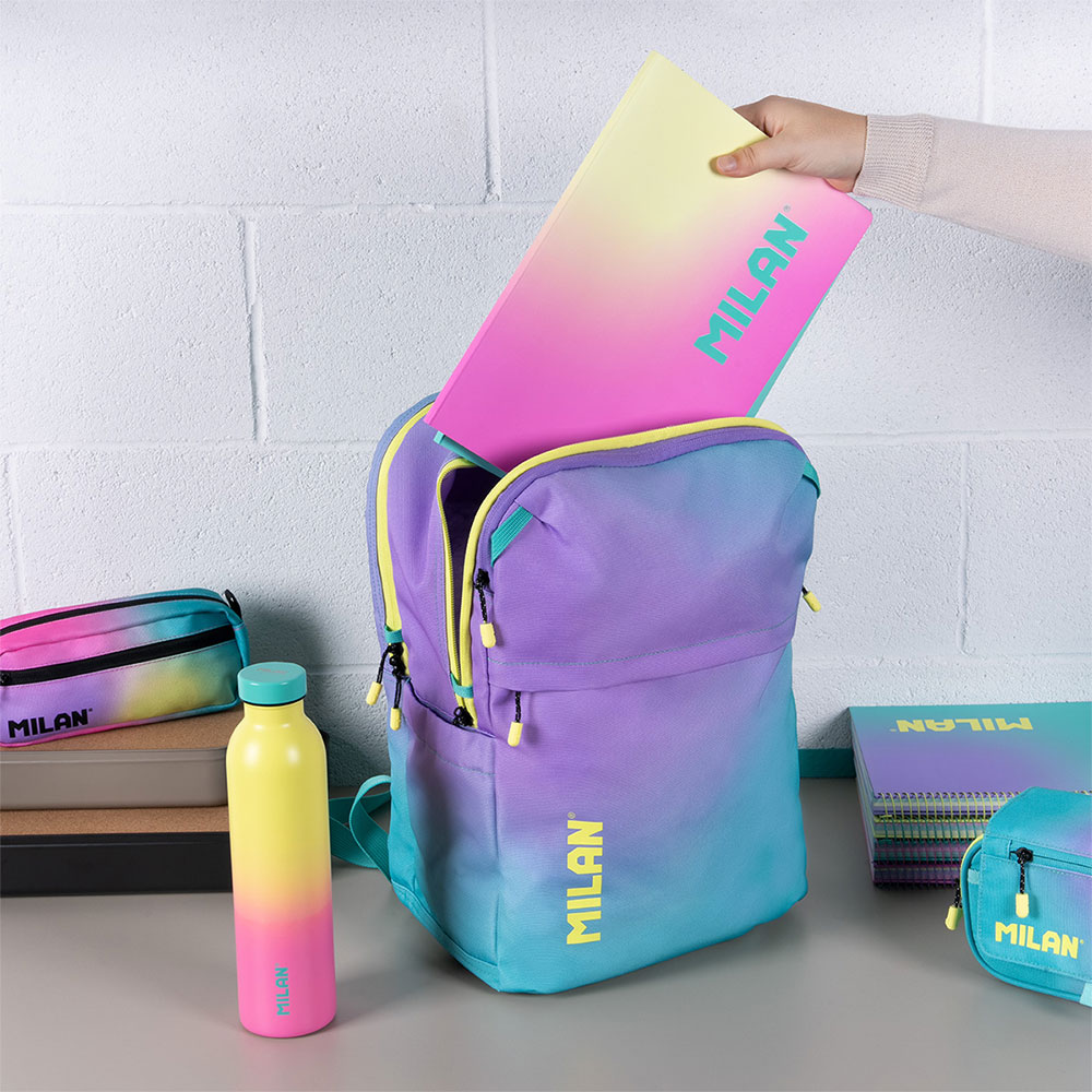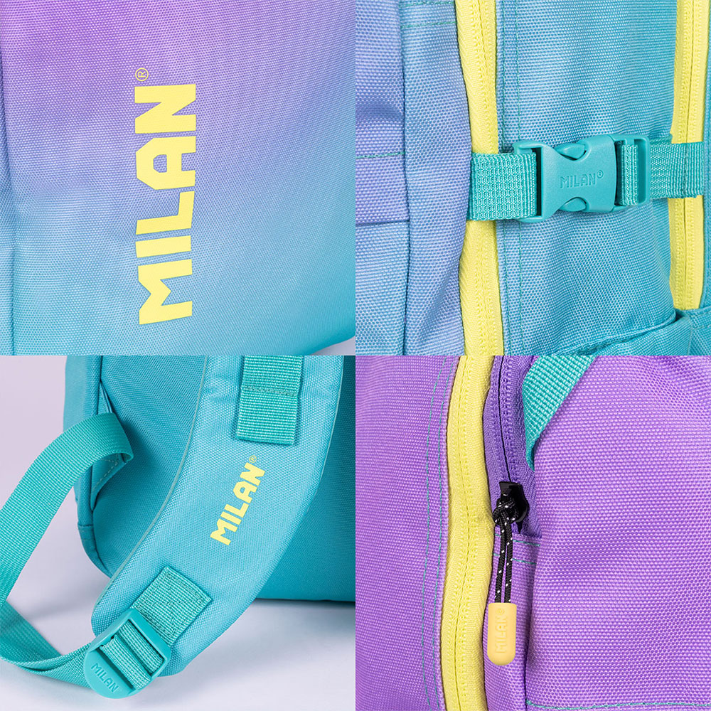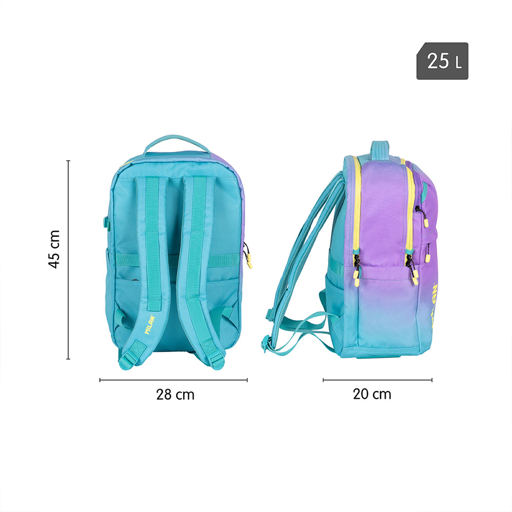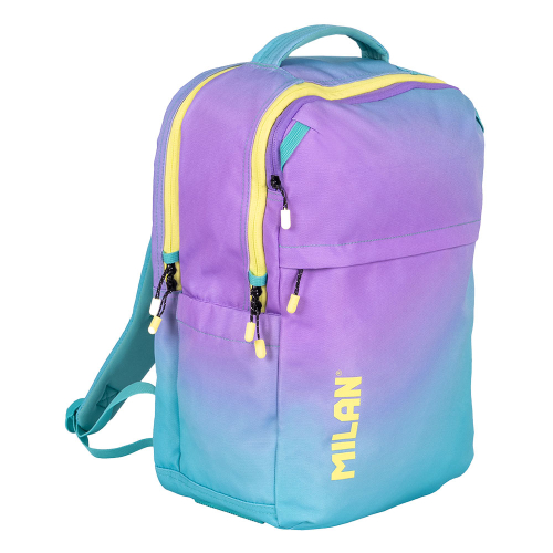 Внесете енергия, стил и готовност за всяко предизвикателство в учебния ден с раница от колекцията Sunset на Milan! Със своя уникален преливащ се дизайн в тюркоазено и жълто, вдъхновен от цветовете на залеза, тя е идеалният аксесоар за тези, които търсят модерен и свеж вид. Моделът предлага допълнително пето отделение, което го прави лидер в организирането на ученическите принадлежности.
