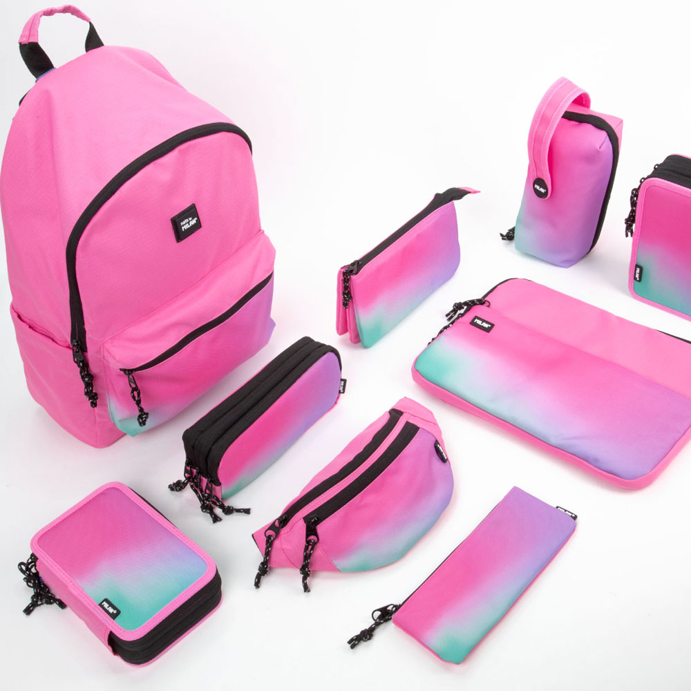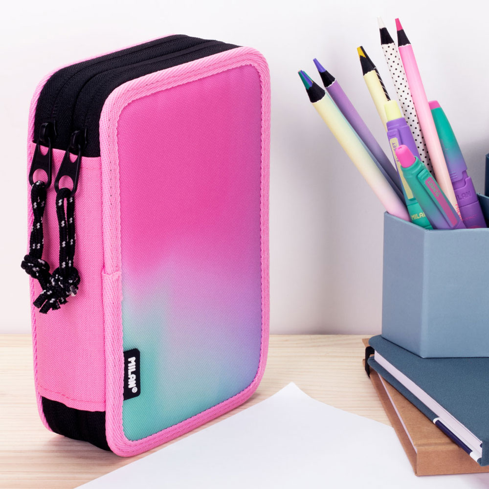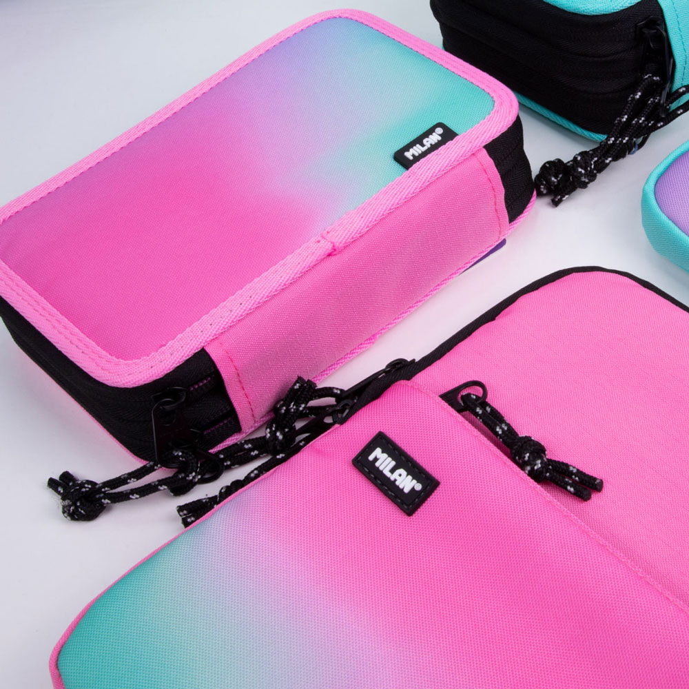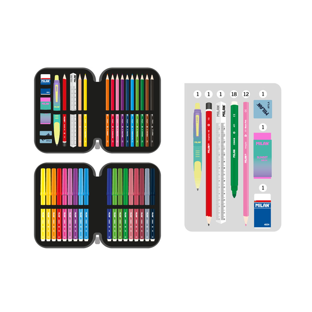 Организирайте учебния ден с безпогрешен стил и качество с пълен комплект от колекция Sunset на Milan! Вдъхновен от преливащите цветове на залеза, модел в тюркоазени и розови нюанси съчетава функционалност с модерна естетика. Компактен, но изключително функционален, той идва напълно оборудван с висококачествени пособия на Milan, готови за употреба още от първия ден.