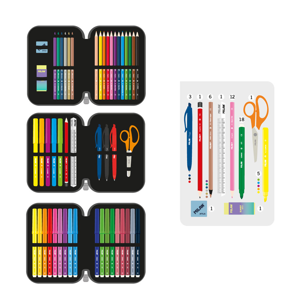 Организирайте учебния ден с безпогрешен стил и качество с пълен комплект от колекция Sunset на Milan! Този модел в елегантен черен цвят с деликатни преливащи нюанси е идеалното решение за ученици, които ценят както естетиката, така и практичността.
