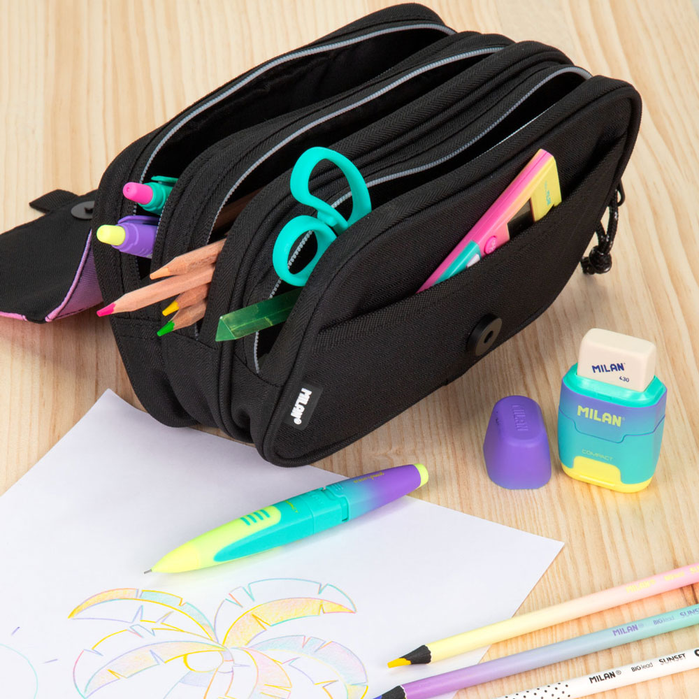 - Компактност и лекота: Със своята издължена форма, несесерът заема минимално място в раницата, като същевременно е достатъчно дълъг за стандартни моливи и тънки линии.