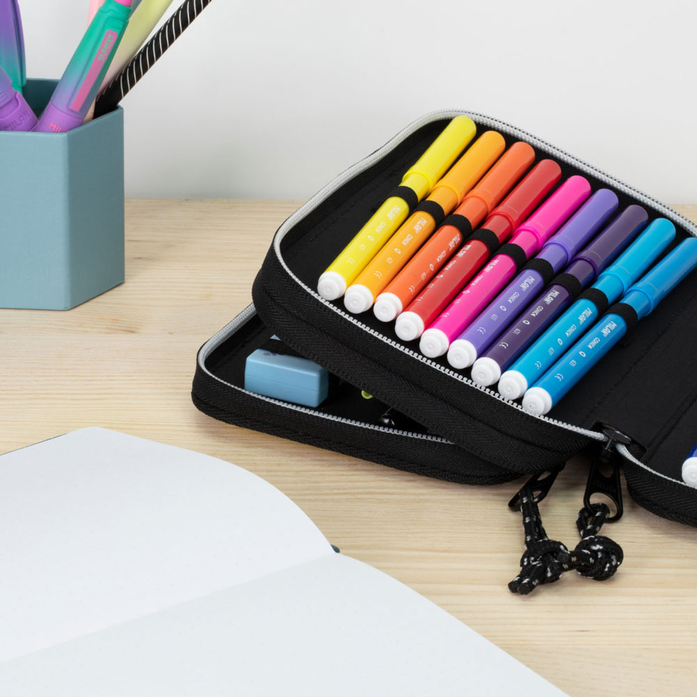 Добавете нотка стил и висока функционалност към училищното ежедневие с пълния несесер от колекция Sunset на Milan! Този модел съчетава вечната класика на черния цвят с нежни, преливащи розови нюанси, създавайки модерна и изтънчена визия. Проектиран за максимално удобство, несесерът пристига при вас с всичко необходимо за писане, чертане и оцветяване.