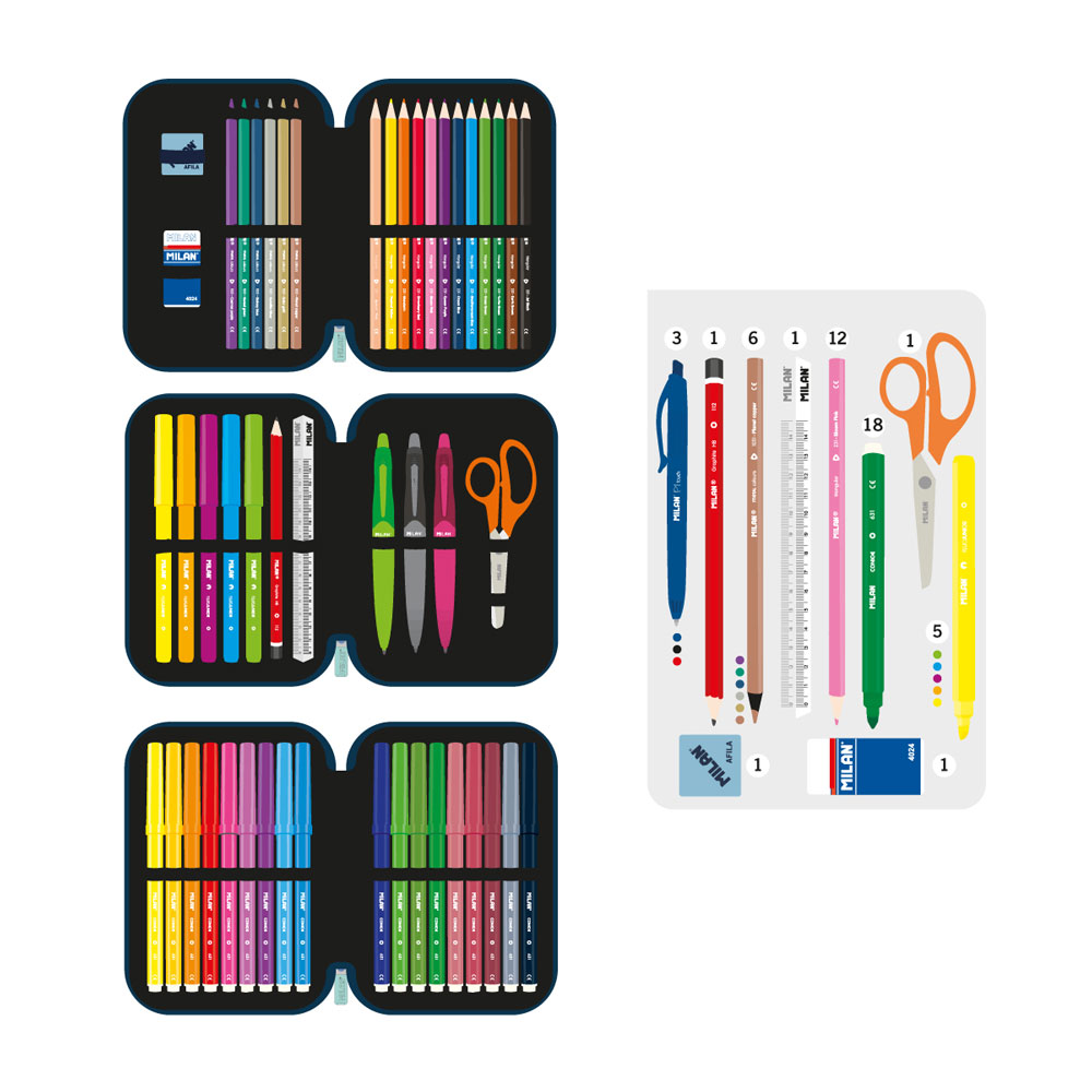 - Пълен комплект: Несесерът включва 49 внимателно подбрани продукта с всичко необходимо за един учебен ден.