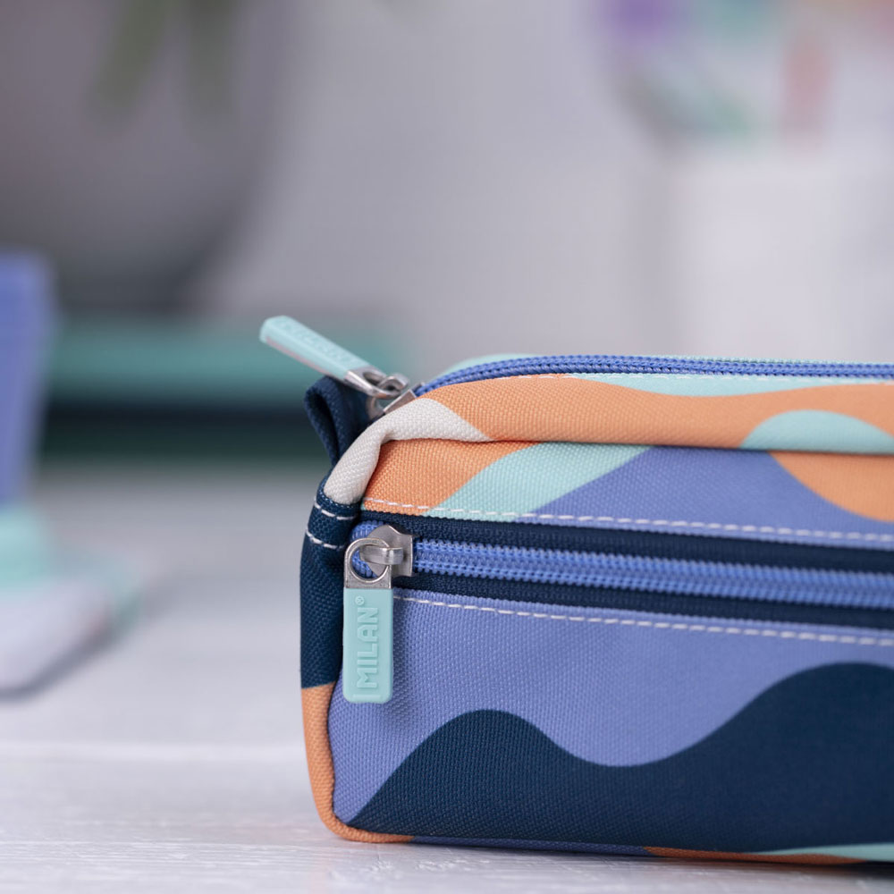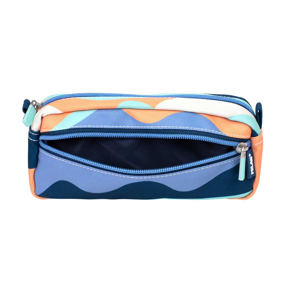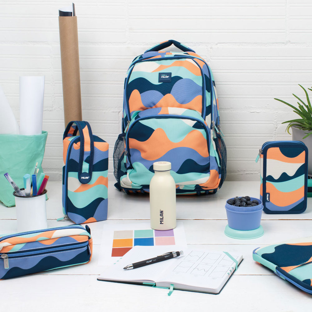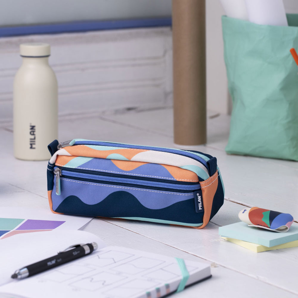За тези, които търсят баланс между функционалност и вдъхновяващ дизайн, представяме правоъгълния модел от серията Fun на Milan. Този несесер е създаден да съпътства всеки творчески проект, предлагайки интелигентно разпределение в свежа синя гама. Дизайнът му е част от колекция, вдъхновена от творчеството, където колажните форми се превръщат в модерен и динамичен десен.