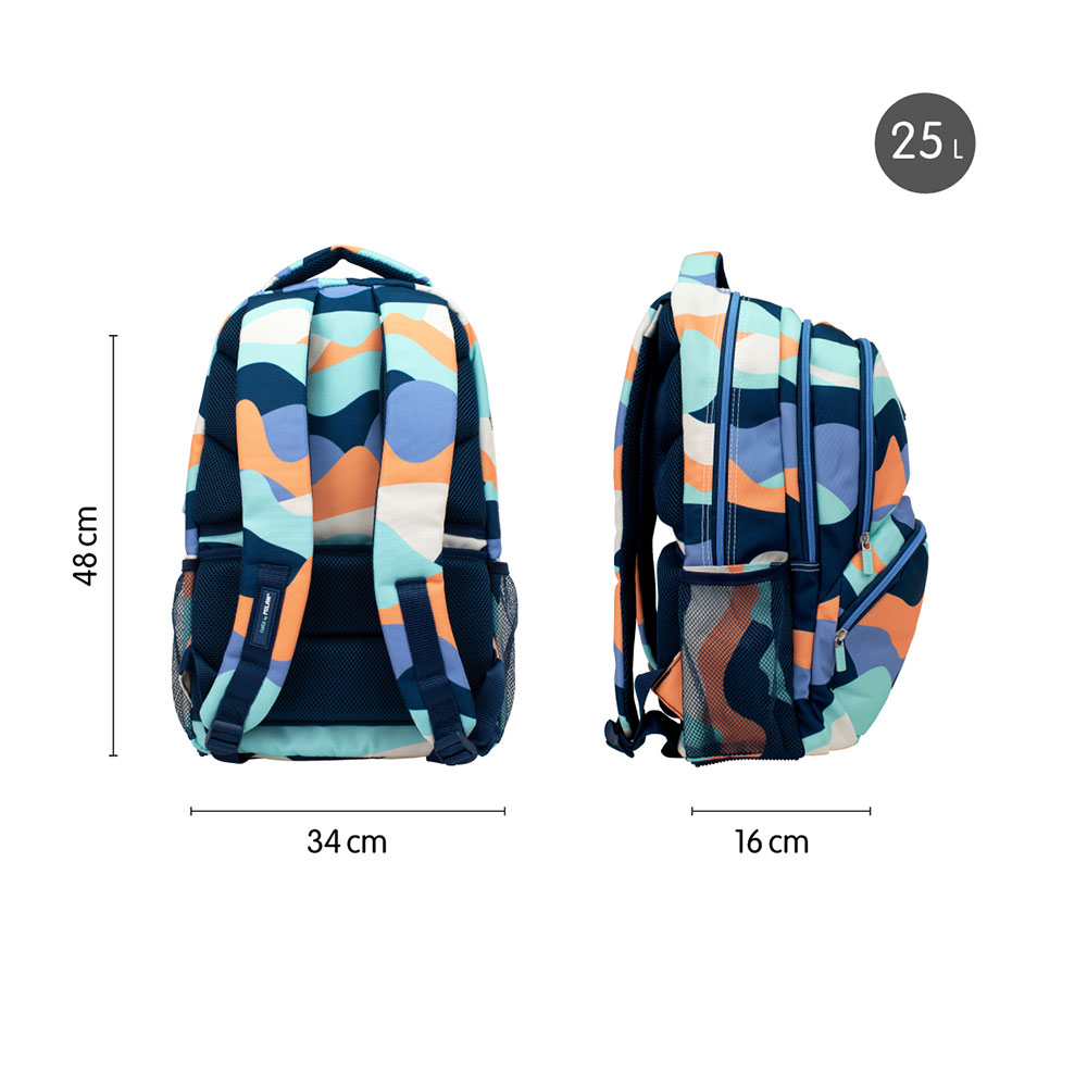 Със своите смели контрасти между кралско синьо, наситено оранжево и светли тонове, тя превръща всеки учебен ден в приключение. С голям капацитет от 25 литра и отлично разпределение, раницата осигурява комфорт и ред през целия ден.