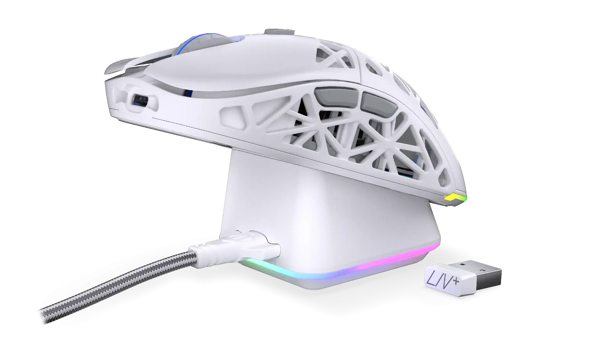 Дишащото тяло на LIV Plus Wireless е вътрешен дизайн. Той съчетава страхотен въздушен поток с бърз – и напълно контролиран – капацитет на движение. В него има първокласен сензор PixArt PAW3395, осигуряващ максимална DPI от 26 000 и скорост на проследяване от 16,51 m/s. Просто свържете LIV Plus Wireless към вашия компютър, конзола или телефон и това е.