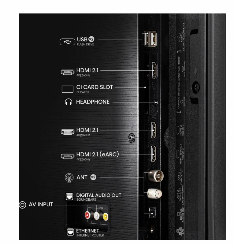 3 HDMI, 2 USB, S/PDIF out, Audio (L/R) in, headphone, Composite (AV) in, Cl+, 2 RF In |
