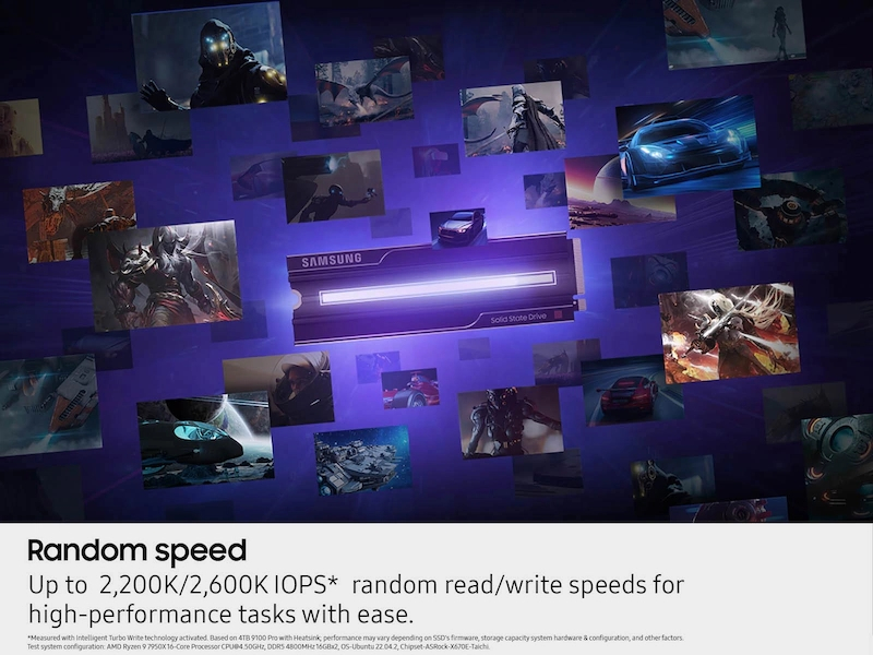 Пламтяща скорост. Масивен капацитет. Създаден за AI и извън него. С до два пъти по-висока скорост от 990 PRO SSD. Samsung 9100 PRO с Heatsink SSD претоварва натоварванията на AI, 4K видео изобразяване и игри.