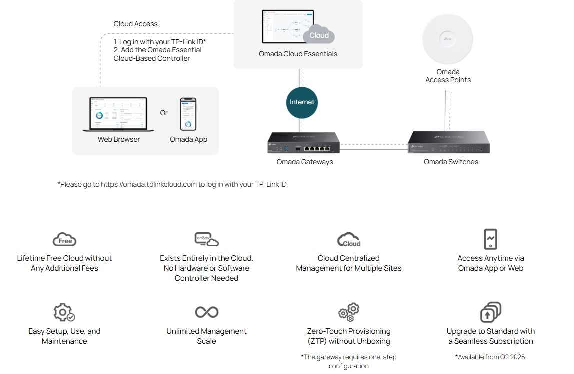 Omada Cloud Essentials е безплатна и лесна за използване облачна платформа за управление на мрежовата система Omada, обхващаща access point-и, суичове и gateway устройства. Тя предлага опростено, централизирано управление и мониторинг с основни функции, което я прави идеална за мрежи за видеонаблюдение и малки бизнеси, които не се нуждаят от сложността на по-големи решения.