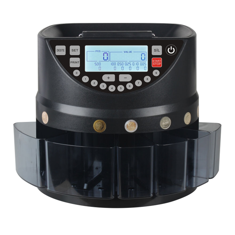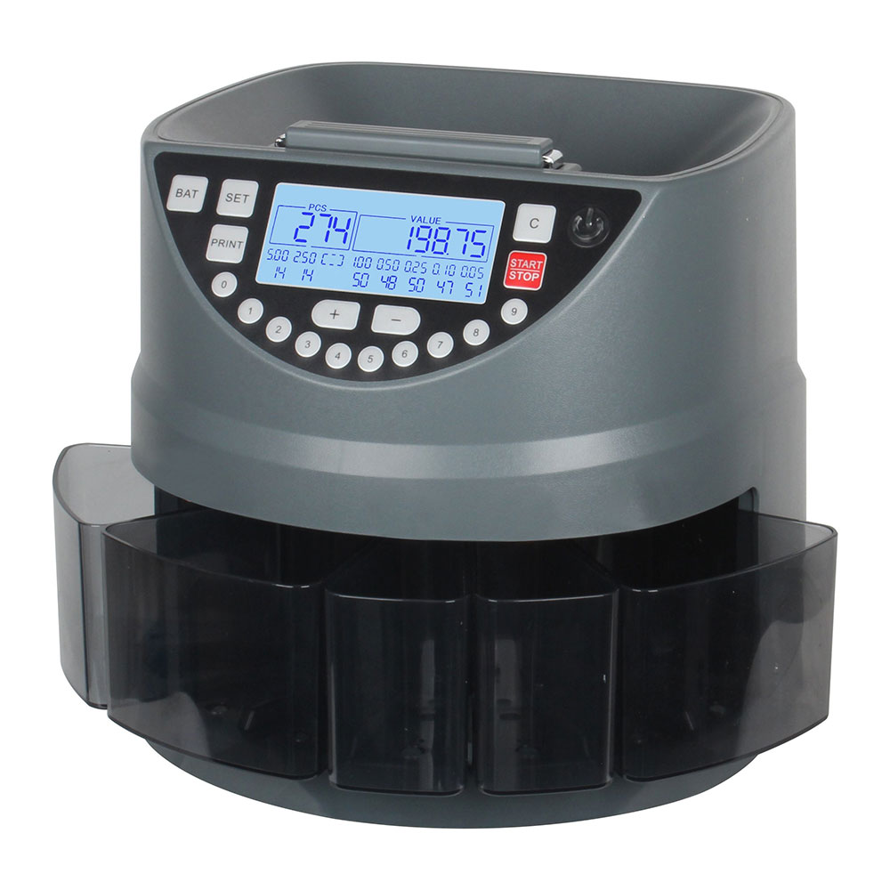 This coin counting machine is optimized for handling Euro coins, providing reliable and precise counting at speeds of up to 270 coins per minute.
