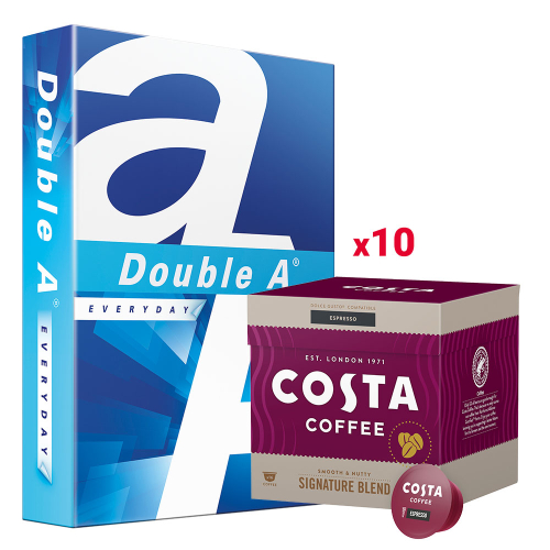 10 packs of Double A Everyday A4 copy paper + Costa Coffee capsules, compatible with Nescafe® Dolce Gusto® machines.
