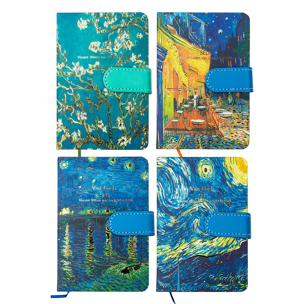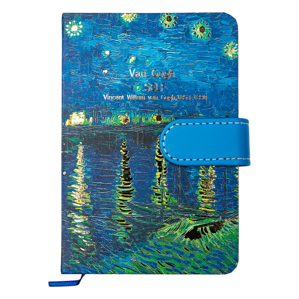 A6 notebook with hardcover. Magnetic closure. Ribbon divider and colored page edges.