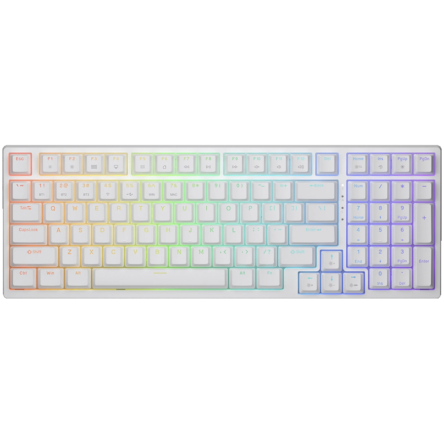 The keyboard offers three connection modes - wired, 2.4GHz wireless and Bluetooth, with the ability to connect to up to 5 devices simultaneously and quickly switch between them. The compact 98% layout saves space without compromising on functionality.