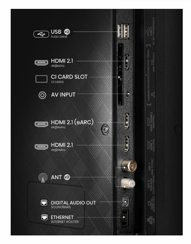 3 HDMI, 2 USB, S/PDIF out, CI+ Slot, Composite (AV) in, 2 RF In, Audio (L/R) in, Headphone out |